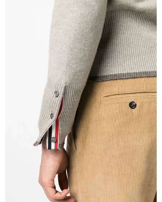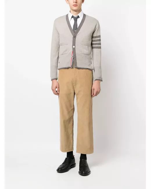 beige cashmere knitted construction signature 4-Bar stripe signature grosgrain loop tab V-neck front button fastening long sleeves two front patch pockets