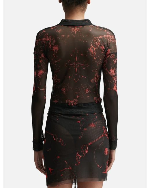 OttolingerMesh Polo TopFittedMesh semi-sheer constructionGraphic print throughoutPolo collarButton placketLong sleevesStraight hemColor: Skribbl Red