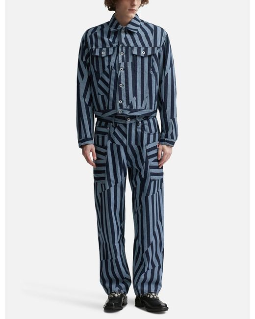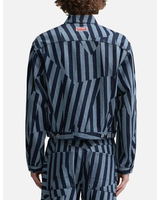 KenzoKenzo Dazzle Stripe Trucker JacketBoxy fitJapanese denimDazzle stripe pattern throughoutClassic collarButton closureLong sleevesButtoned cuffsTwo buttoned flap pockets on the chestTwo welt side pocketsWoven logo label on the yokeAdjustable hem with button strapColor: Rinse Blue Denim