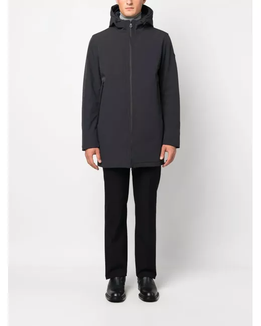 navy blue stretch-design logo patch at the sleeve drawstring hood high neck front two-way zip fastening two side zip-fastening pockets long sleeves straight hem above-knee length