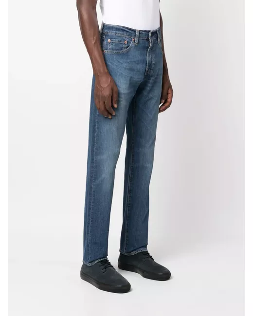dark blue cotton denim stonewashed logo patch to the rear mini logo tag belt loops front button and zip fastening straight leg classic five pockets