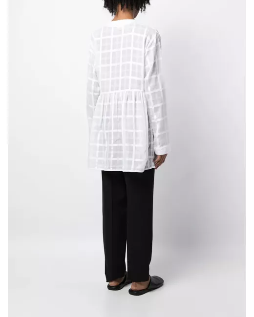 white cotton check pattern pleat detailing V-neck off-centre front fastening long sleeves straight hem