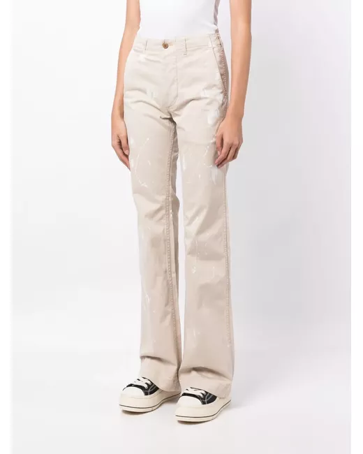 sand beige cotton logo patch to the rear paint splatter detail flared mid-rise belt loops front button and zip fastening front welt pocket two side inset pockets two rear welt pockets
