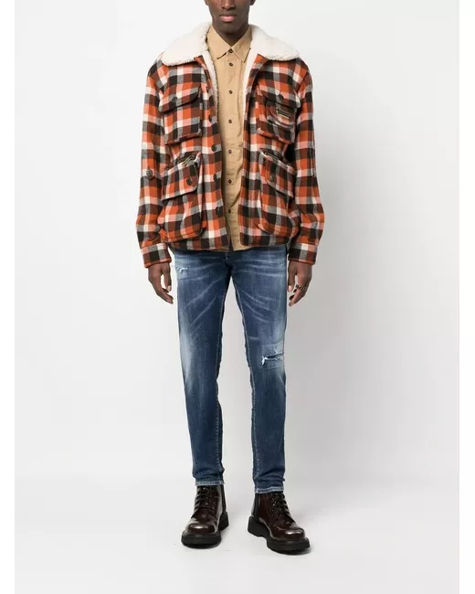burnt orange/chocolate brown virgin wool blend check print logo patch at the chest spread collar front press-stud fastening long sleeves multiple cargo pockets shearling lining