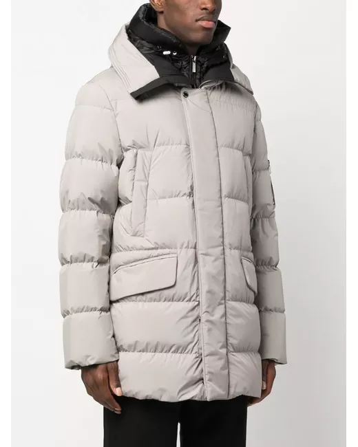 light grey feather down padded design quilted classic hood high neck front press-stud and zip fastening long sleeves sleeve zip pocket two side slit pockets two side flap pockets long sleeves straight hem