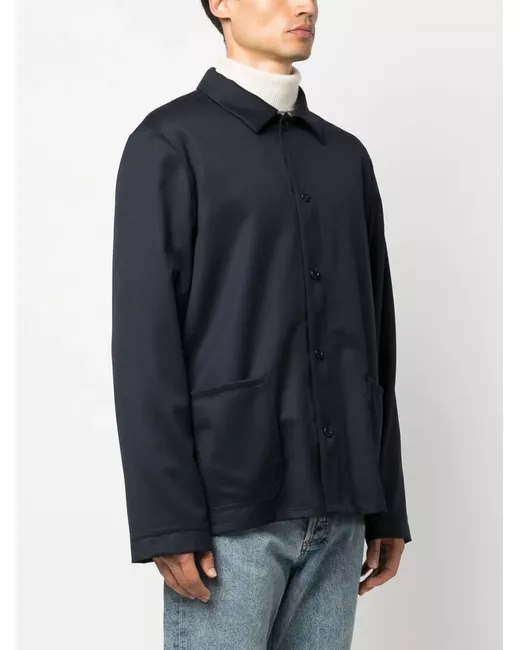 navy blue wool classic collar long sleeves front button fastening two front patch pockets straight hem