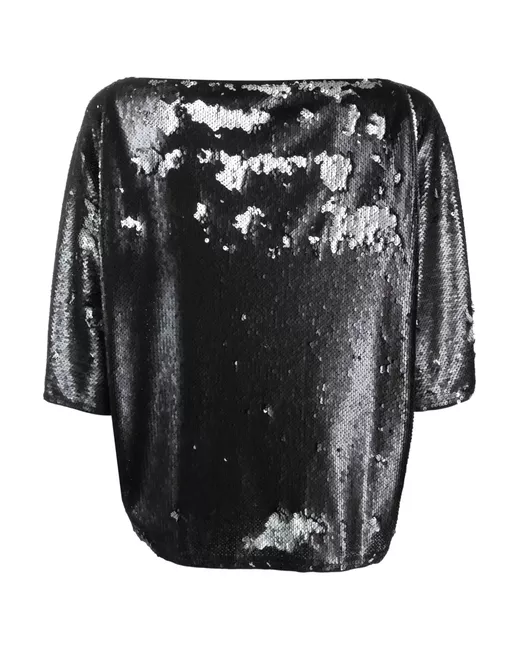 black silver-tone sequin design sequin embellishment boat neck short sleeves straight hem