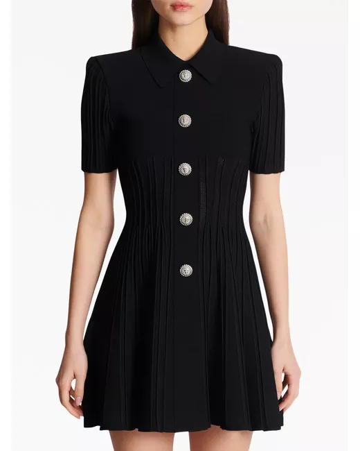 black ribbed knit classic collar front button fastening short sleeves rear zip fastening flared hem thigh-length