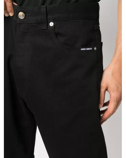 black cotton denim patch detail logo patch to the rear straight leg belt loops concealed fly and button fastening classic five pockets