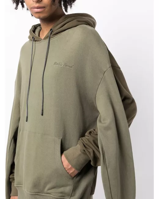 olive green cotton layered design drawstring hood logo print at the chest front pouch pocket long sleeves ribbed cuffs and hem straight hem logo print at the hood