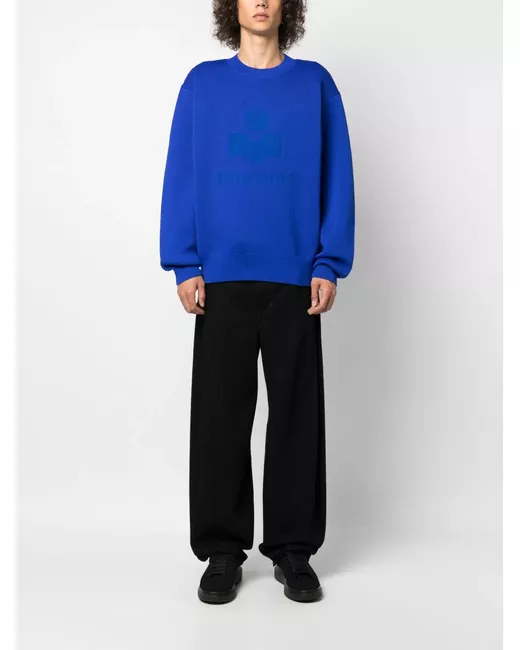 electric blue cotton-wool blend fine knit jacquard logo motif drop shoulder long sleeves crew neck ribbed cuffs and hem