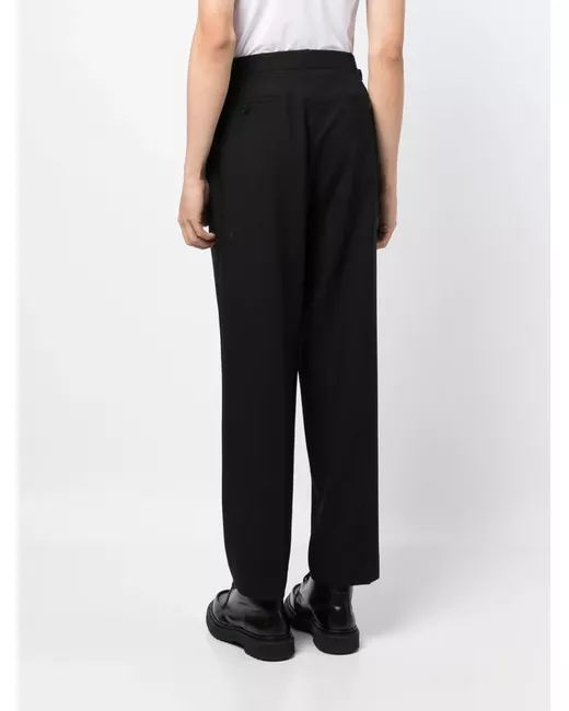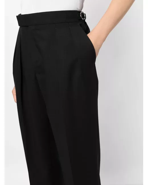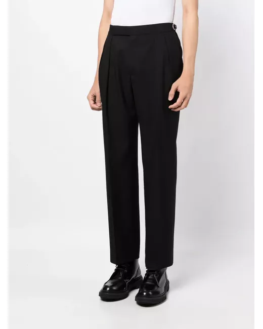 black wool pleat detailing concealed front fastening adjustable side straps straight leg two diagonal pockets to the sides two rear welt pockets straight hem