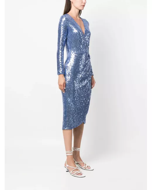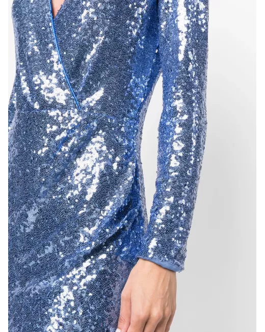 iris blue sequin embellishment wrap design V-neck long sleeves fitted waistline below-knee length curved hem