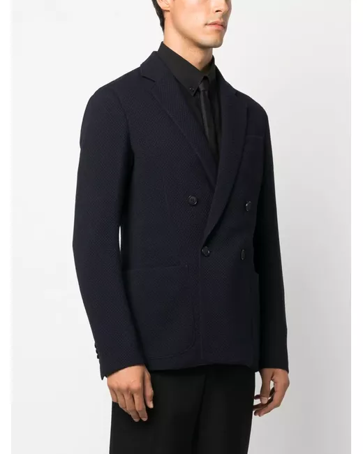 navy blue virgin wool blend notched lapels double-breasted button fastening long sleeves buttoned cuffs chest welt pocket two side patch pockets English rear vents straight hem