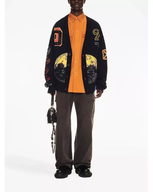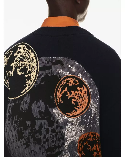 navy blue wool-cotton blend knitted construction moon motif V-neck front button fastening long sleeves two front pouch pockets ribbed cuffs and hem straight hem