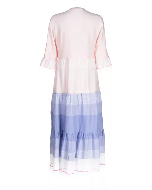 light pink/light blue cotton flared gradient effect ruched detailing V-neck short sleeves mid-length