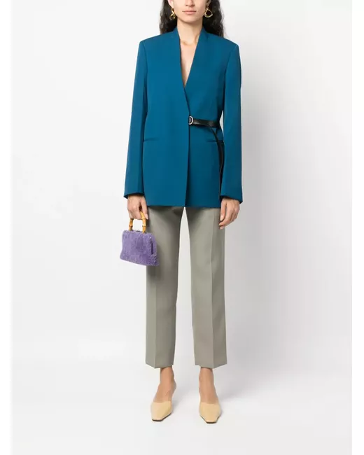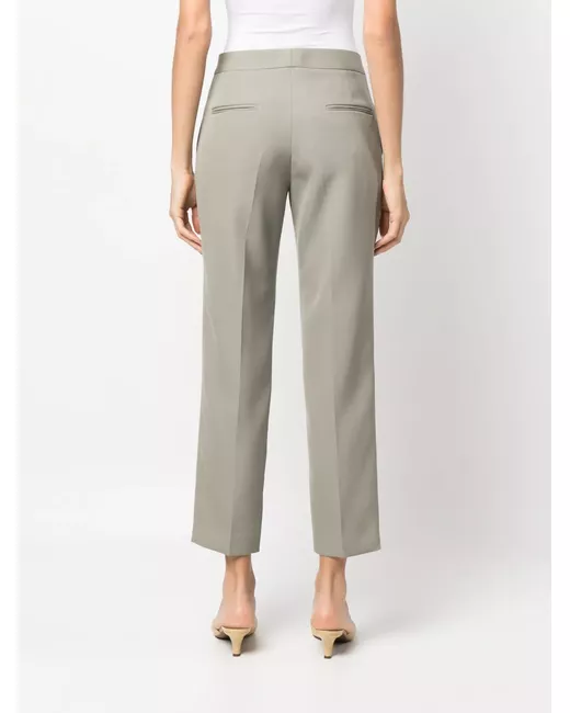 light green wool/cotton gabardine weave tailored cut pressed crease concealed front fastening straight leg slip pockets to the sides two rear welt pockets ankle-length