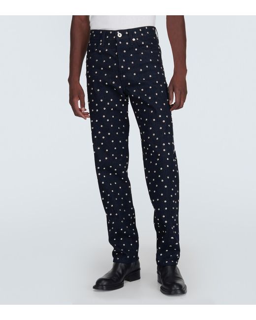 Material: 100% cotton. Care instructions: hand wash. Made in Italy. Designer color name: Navy Blue. Pockets: five pockets. Closure: concealed button placket. Embroidery: 100% brass.