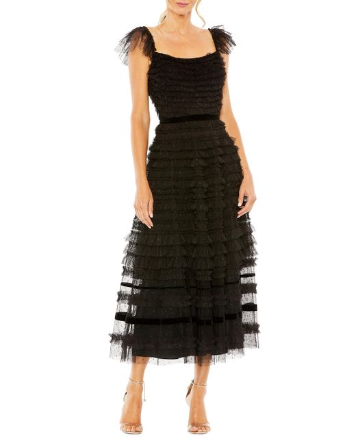 Decorated with a velvet band at the waist, Mac Duggal's tulle cap-sleeve gown flaunts a tiered ruffle construction. Squareneck Cap sleeves Back-zip closure 100% polyester Lining: 100% polyester Spot clean Imported of Imported fabric SIZE & FIT About 52" from shoulder to hem Model measurements: 5'10" tall Model is wearing a US size 4. Dress Collections - Mac Duggal > Mac Duggal > Saks Fifth Avenue > Barneys. Mac Duggal. Color: Black. Size: 14.