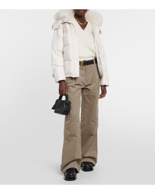 Material: 100% polyester. Care instructions: machine wash at 30 degrees. Made in France. Designer color name: Flocon. Trim: 100% shearling. Lining: 100% polyester. Filling: 90% down, 10% feathers. Closure: zipped front. Pockets: side slit pockets. Contains non-textile parts of animal origin. Comes with garment bag.