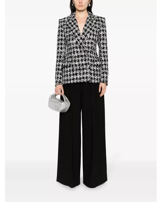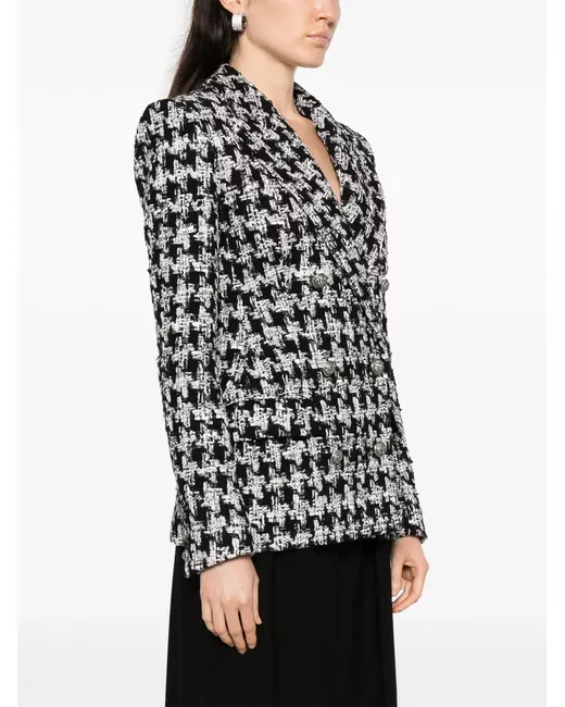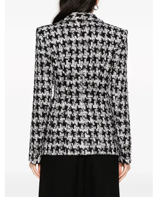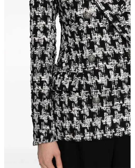 black/ash grey cotton-linen blend bouclé construction houndstooth pattern embossed silver-tone buttons wide peak lapels double-breasted button fastening long sleeves buttoned cuffs two front flap pockets straight hem