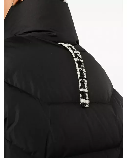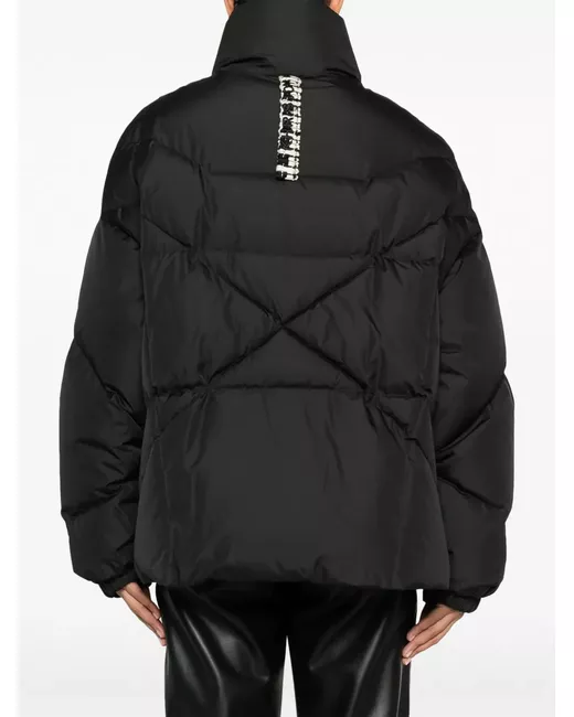 black down-feather filling padded design quilted logo patch to the rear funnel neck front zip fastening drop shoulder long sleeves elasticated cuffs two diagonal pockets to the sides high-low hem