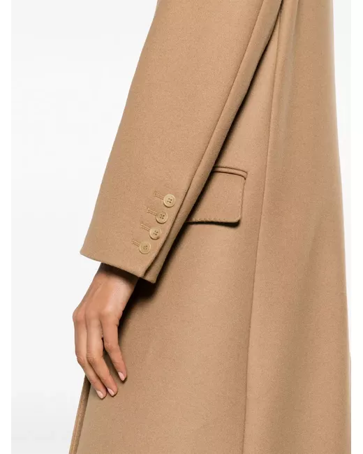 almond beige wool-cashmere blend peak lapels double-breasted button fastening long sleeves buttoned cuffs straight hem long length chest welt pocket two side flap pockets
