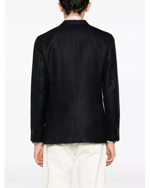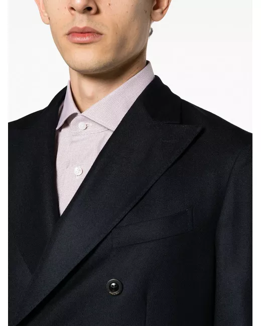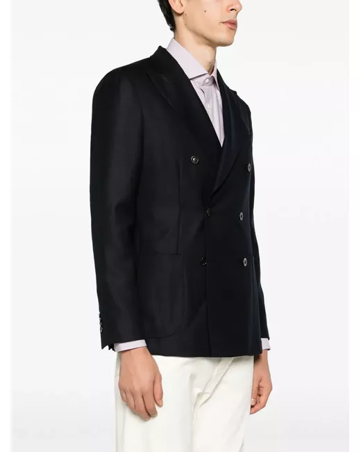 navy blue virgin wool peak lapels double-breasted button fastening long sleeves buttoned cuffs chest welt pocket two front patch pockets no lining