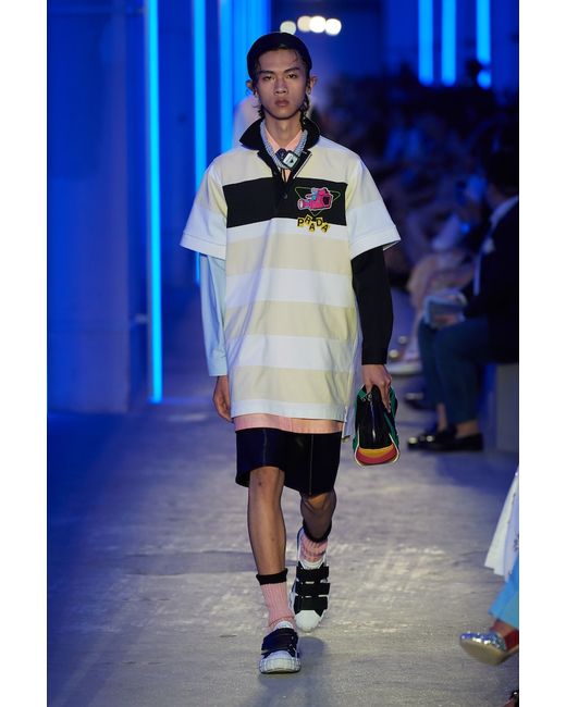 This oversized Prada polo shirt features horizontal stripes in yellow and white, has a contrasting black collar and mother-of-pearl buttons, and is finished with a playful camera print on the left chest.