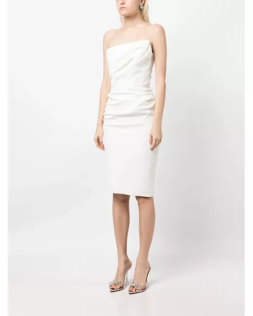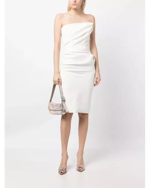 ivory white stretch-silk draped design bandeau style rear zip fastening central rear vent mid-length