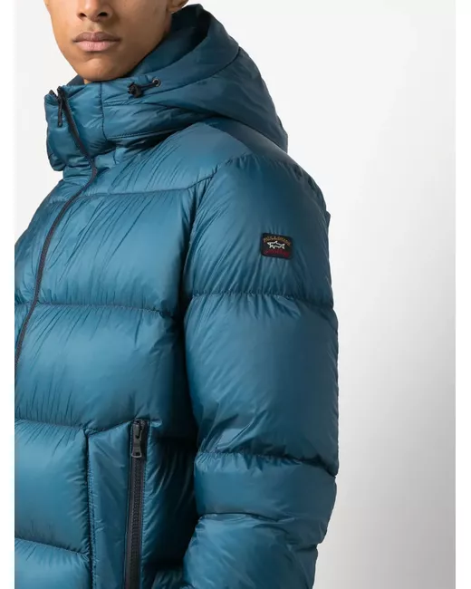 duck egg blue feather down padded design logo patch at the sleeve classic hood stand-up collar front two-way zip fastening two diagonal pockets to the sides long sleeves straight hem