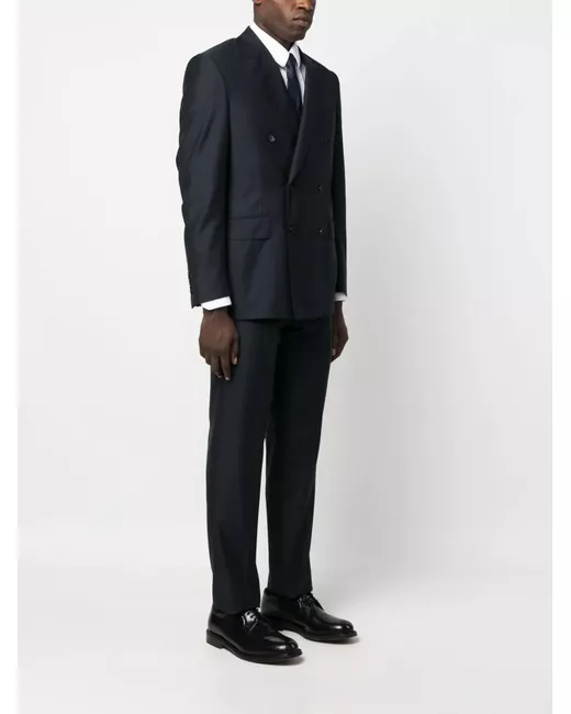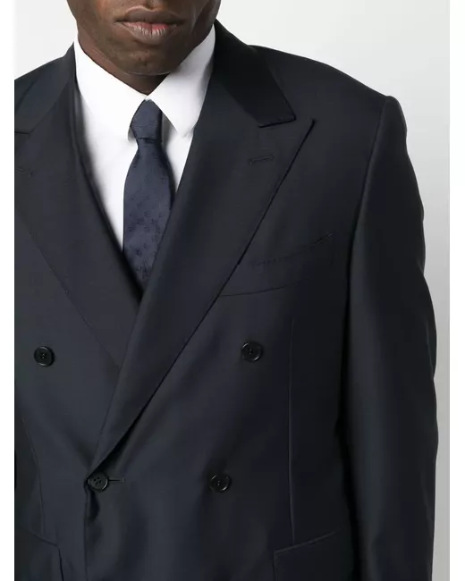 midnight blue wool Jacket: logo patch at the sleeve peak lapels front button fastening long sleeves buttoned cuffs jetted chest pocket two front flap pockets straight hem full lining Trousers: slim cut pressed crease belt loops two side inset pockets two rear welt pockets