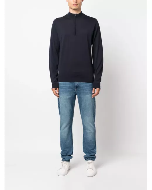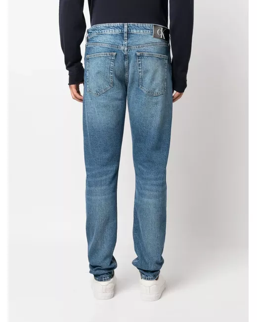 navy blue cotton blend light wash logo patch to the rear belt loops slim cut button fly fastening classic five pockets