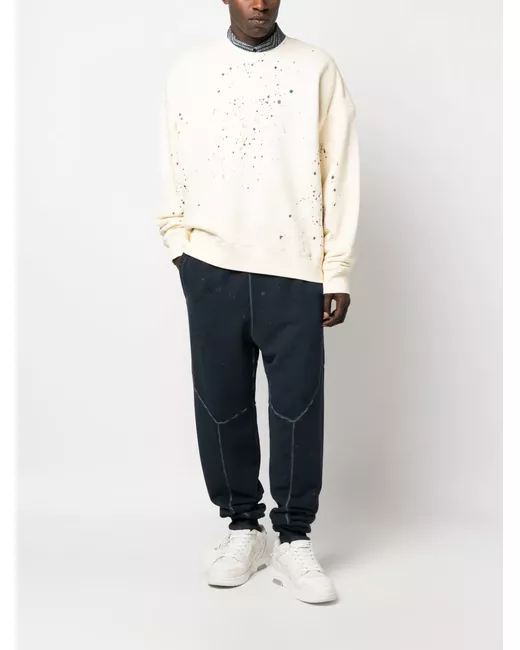navy blue cotton panelled design contrasting trim elasticated drawstring waistband two side slit pockets rear welt pocket tapered leg elasticated ankles