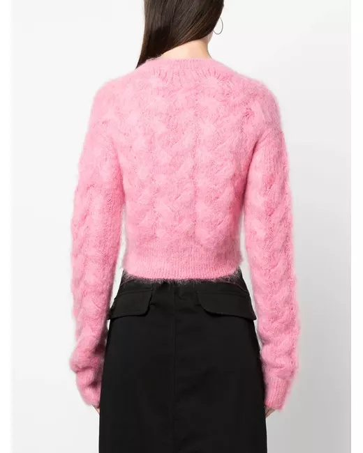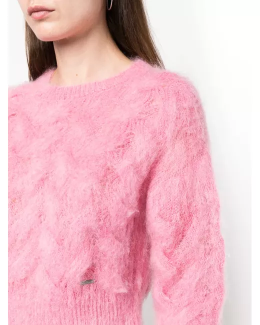 brushed mohair-blend jumper from DSQUARED2 featuring bubblegum pink, mohair blend, brushed effect, silver-tone logo plaque, cropped, round neck, long sleeves and straight hem.