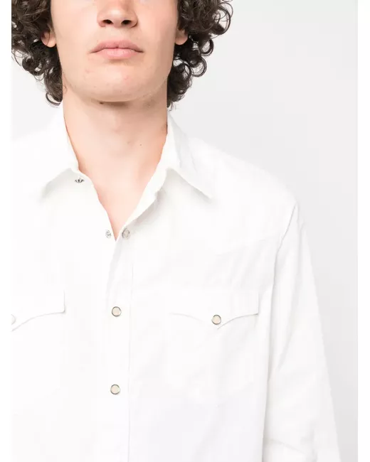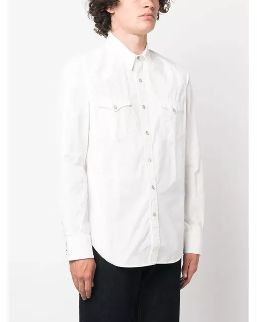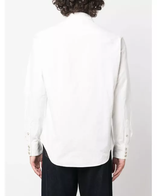 white cotton classic collar front button fastening long sleeves buttoned cuffs two front flap pockets curved hem