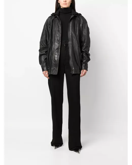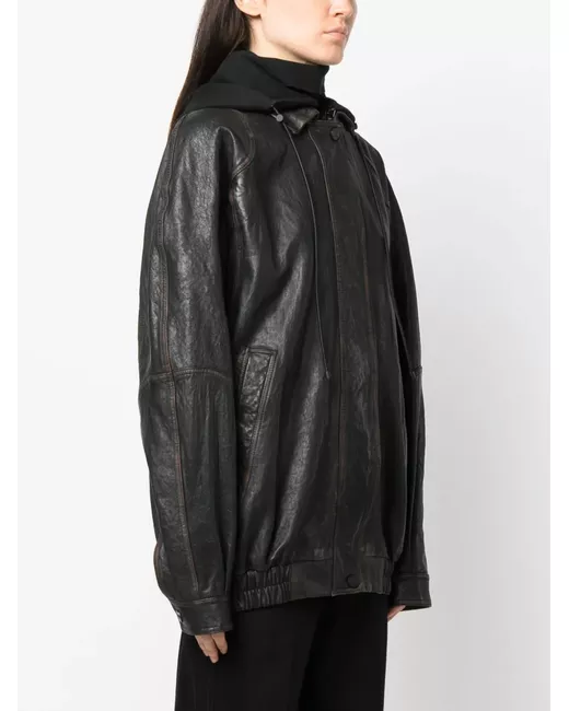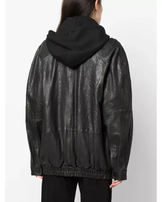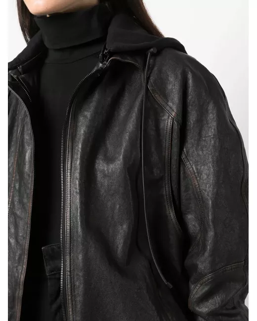 black leather/cotton drawstring hood front press-stud and zip fastening long sleeves buttoned cuffs two side inset pockets elasticated hem full lining