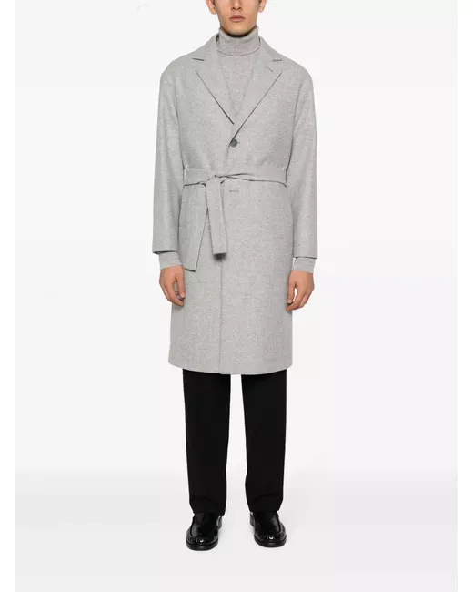 light grey virgin wool blend tailored cut notched lapels front button fastening long sleeves belted waist two side welt pockets straight hem knee-length