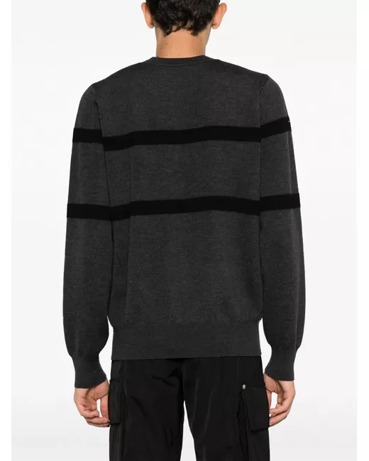 anthracite grey wool knitted construction intarsia-knit logo ribbed trim crew neck long sleeves ribbed cuffs and hem straight hem