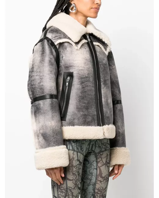 charcoal grey/ivory white faux leather faux-shearling trim spread collar front two-way zip fastening long sleeves two side zip-fastening pockets straight hem