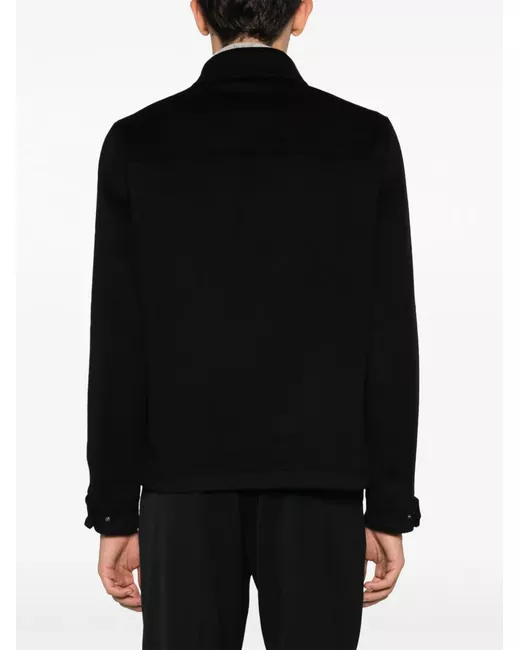 black virgin wool-cashmere blend notched lapels front button fastening long sleeves buttoned cuffs two chest flap pockets two side welt pockets straight hem