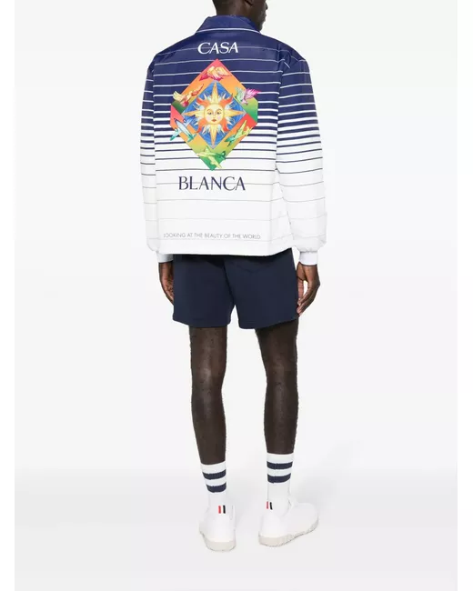 blue/white horizontal stripe pattern logo print at the chest logo print to the rear rounded collar front button fastening long sleeves elasticated cuffs two side welt pockets drawstring hem
