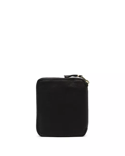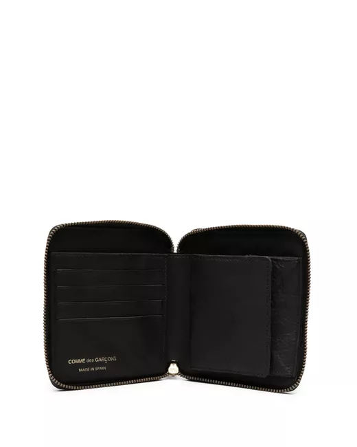 black leather all-around zip fastening internal logo stamp internal card slots internal note compartments coin pocket