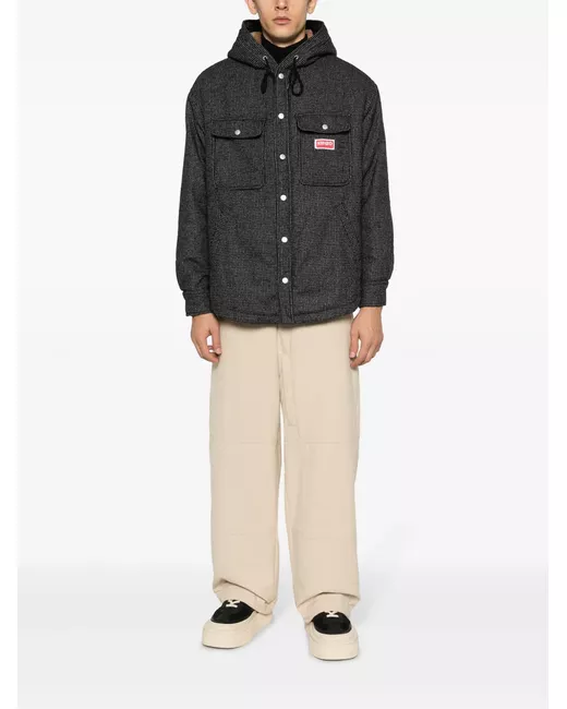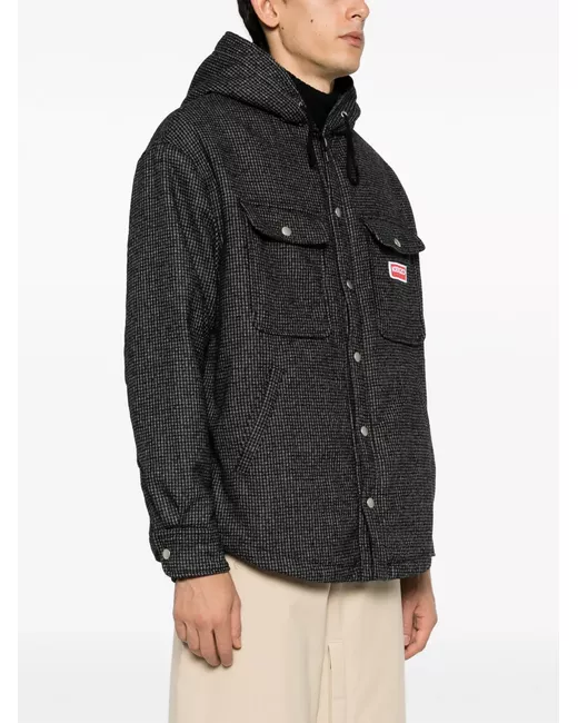dark grey/camel brown cotton-wool blend houndstooth pattern logo patch at the chest drawstring hood front press-stud fastening long sleeves buttoned cuffs two side welt pockets two stud-fastening chest pockets fleece lining