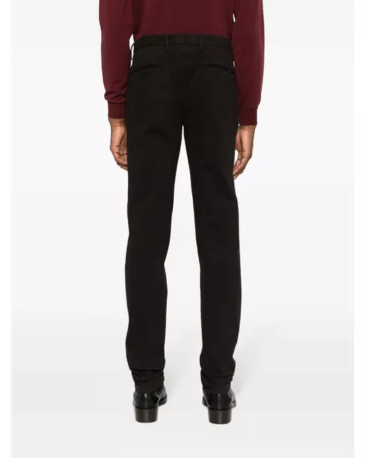 coffee brown stretch-cotton pressed crease logo patch to the front belt loops asymmetric front button fastening slim cut two side inset pockets two rear jetted pockets straight hem