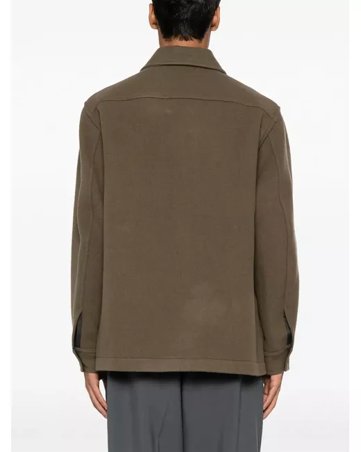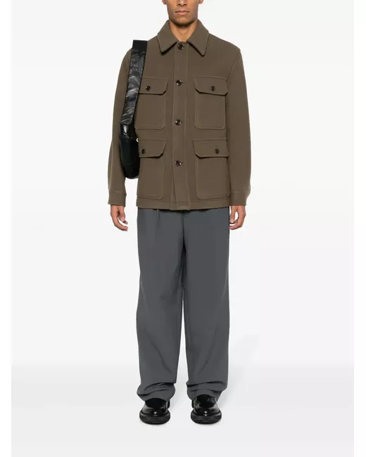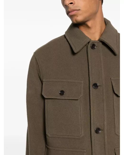 khaki wool classic collar front button fastening long sleeves buttoned cuffs two chest flap pockets two front flap pockets straight hem cotton lining
