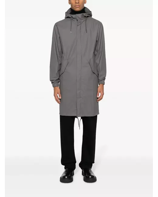 cool grey lightweight construction stand-up collar drawstring hood front press-stud and zip fastening long sleeves elasticated cuffs two side flap pockets drawstring hem mid-length waterproof windproof