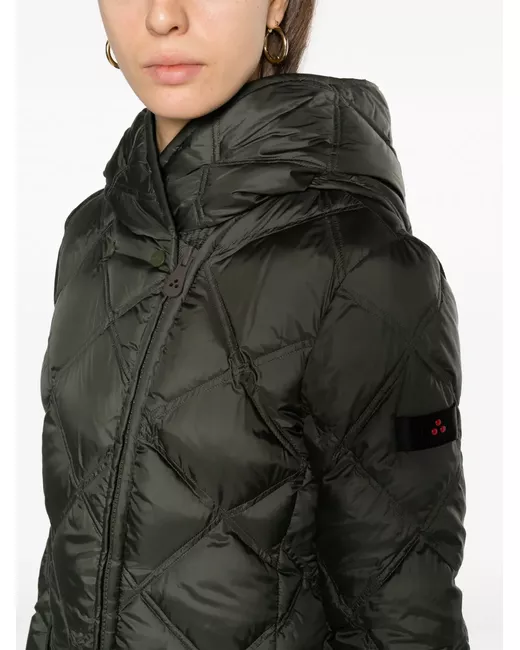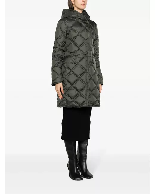 olive green feather down quilted classic hood front zip fastening long sleeves two front flap pockets mid-length