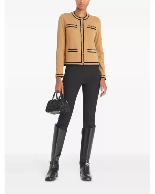 camel brown merino wool knitted construction front button fastening logo-embossed buttons stripe detailing round neck long sleeves silk lining straight hem