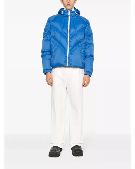 royal blue feather down quilted drawstring hood front zip fastening long sleeves two side slit pockets straight hem